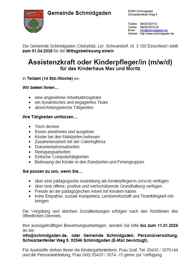 Die Gemeinde Schmidgaden sucht zum nächstmöglichen Zeitpunkt einen Seniorenbeauftragten (m/w/d).