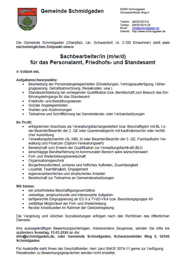 Stellenausschreibung - Sachbearbeiter/in (m/w/d) für das Personalamt, Friedhofs- und Standesamt