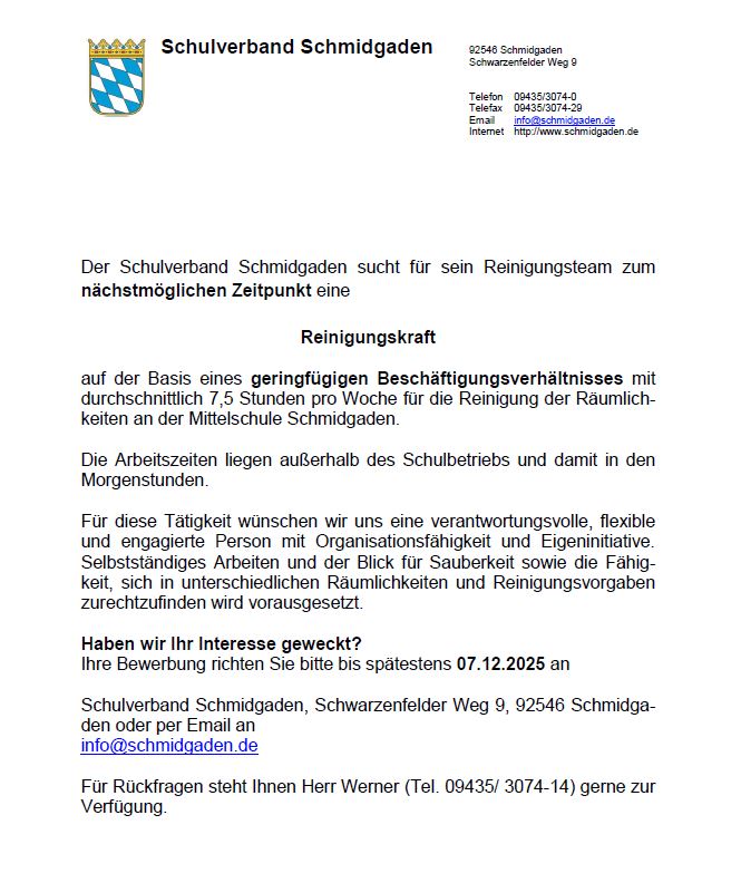 Der Schulverband Schmidgaden sucht eine Reinigungskraft.